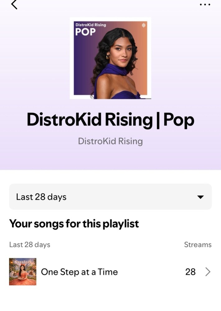 Coralee’s song “One Step at a Time” has been selected for DistroKid’s Rising | Pop playlist.